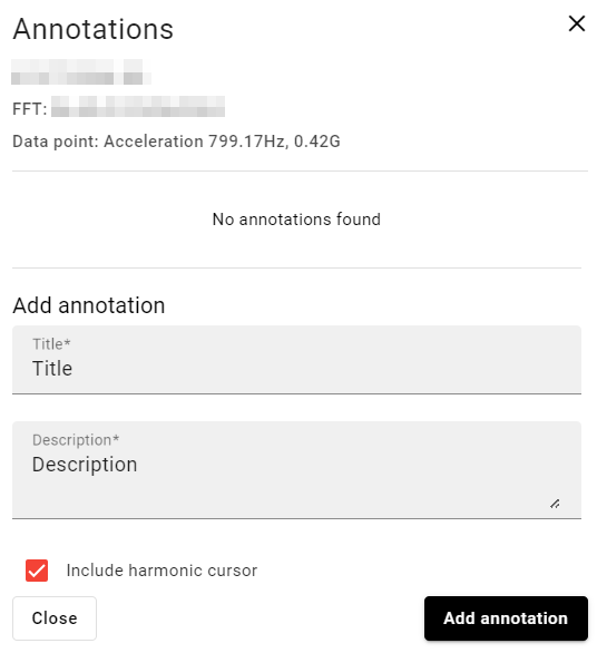 The user must add a title and description, additionally, the user can include the harmonic cursors if these are on the graph by marking the checkbox at the bottom of the pop-up window.