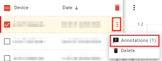 Point annotations will show at the point of the graph where they were saved. General annotations can be accessed using the vertical ellipsis on the FFTs list. Clicking on it will make a drop-down menu appear with the option Annotations.