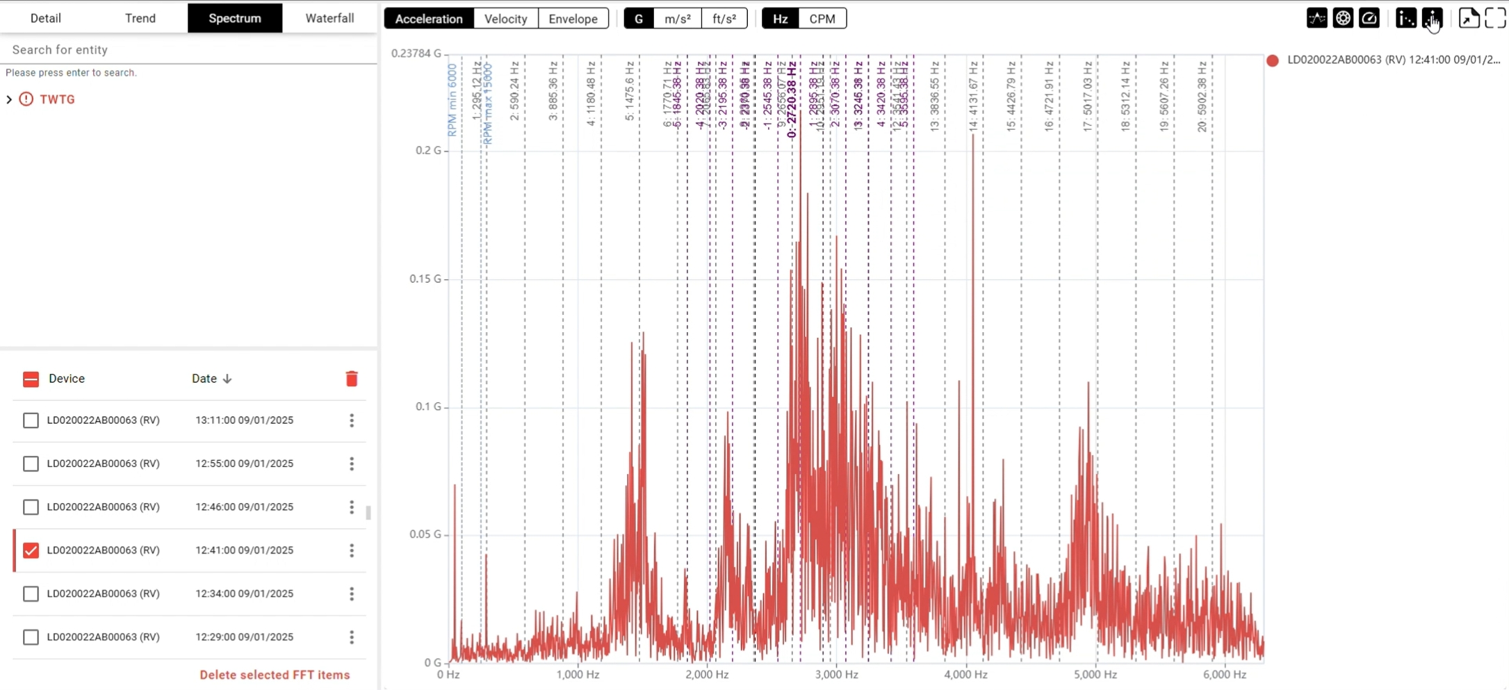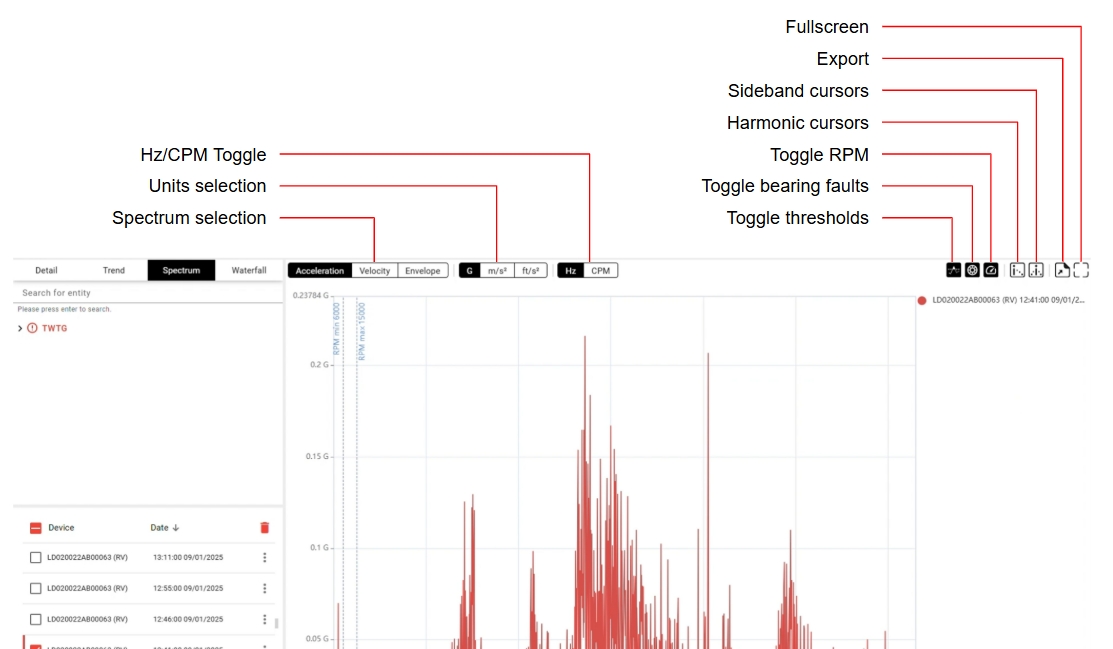 The Spectrum view displays data related to the FFT in a graphical representation. At the machine level, all the FFTs of all the devices attached to the machine are available, while at the device level, only the FFTs of the selected device can be seen.