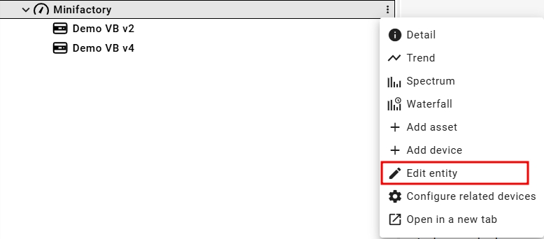 On the asset tree, click on the three dots next to the name of the asset. On the dropdown menu, select Edit entity. Alternatively, the user can click on the pencil icon at the top of the asset's detail dashboard.