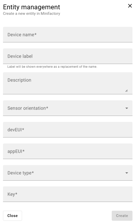 In order to add a device, 6 mandatory and 2 optional fields can be filled. To be able to add a device, all mandatory fields should be filled. The mandatory fields are designated by an asterisk '*'. When done, click the Create button in the bottom right corner to add the device.