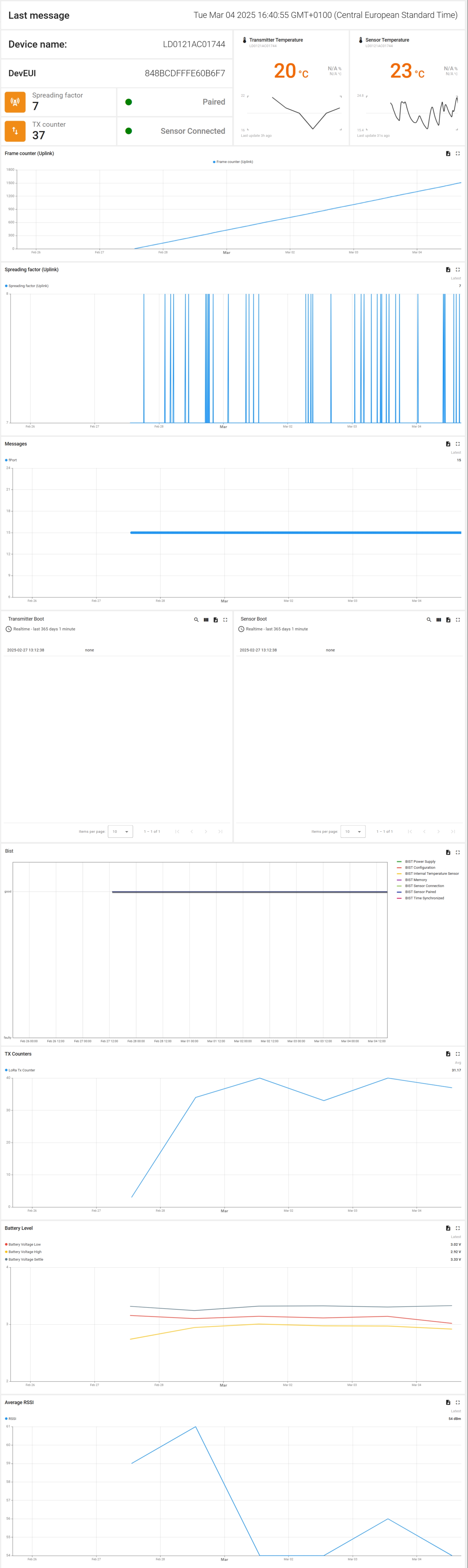 Transmitter and Sensor Boot tables: table with timestamp and reason for booting of the sensor and the transmitter.
