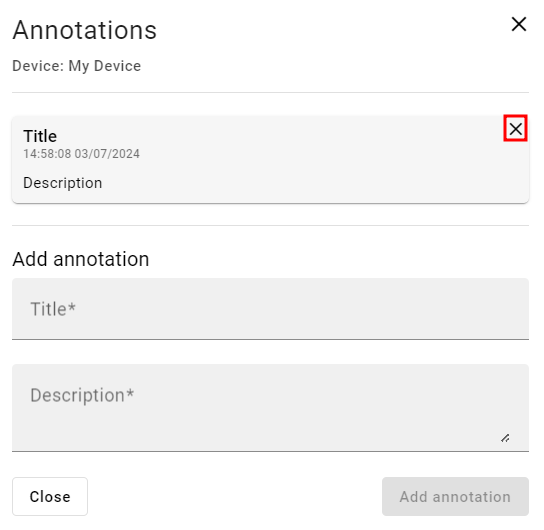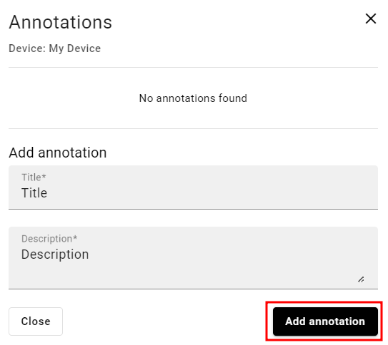 On the pop-up screen, a title and a description of the annotation can be established. Click on the Add annotation button to add it to the machine.
